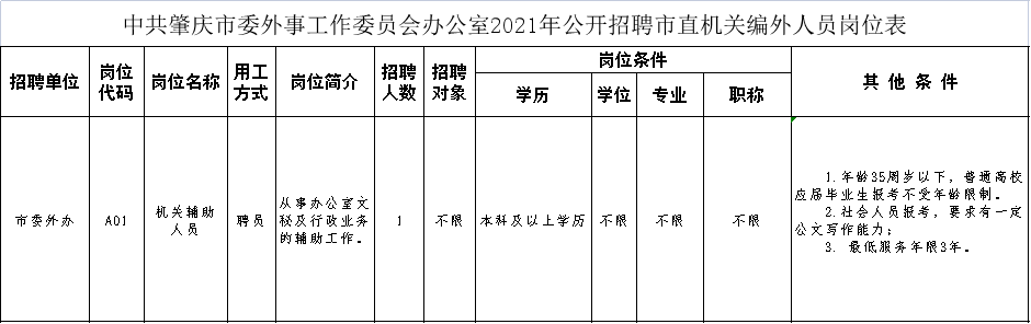 (1)《中共肇慶市委外事工作委員會(huì)辦公室公開招聘市直機(jī)關(guān)編外人員報(bào)名表》(一式一份,見附件2,可在“肇慶外事”微信公眾號(hào)下載);