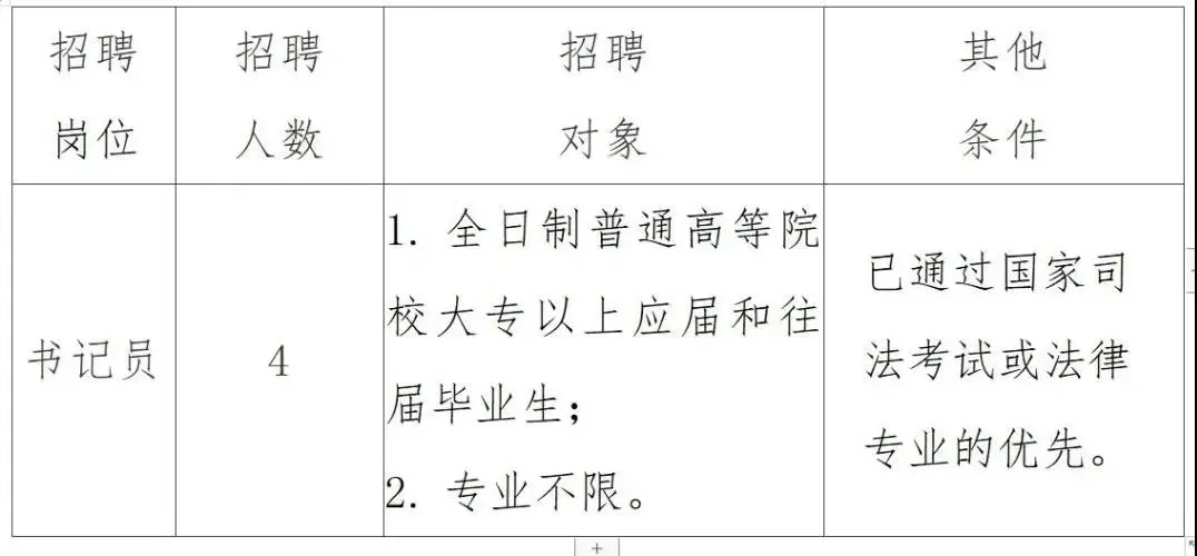 書記員招聘對象為全日制普通高等院校大專以上學歷的應、往屆畢業(yè)生,在2021年7月30日以前已經(jīng)取得畢業(yè)證。