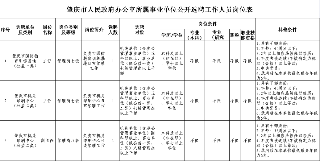 3、報名材料:《肇慶市人民政府辦公室所屬事業(yè)單位公開選聘工作人員報名表》,本人二代身份證、學(xué)歷學(xué)位證書復(fù)印件,相應(yīng)層級任職證明、單位同意報名證明及相關(guān)資格條件的證明資料,本人近期大一寸彩色免冠照片。
