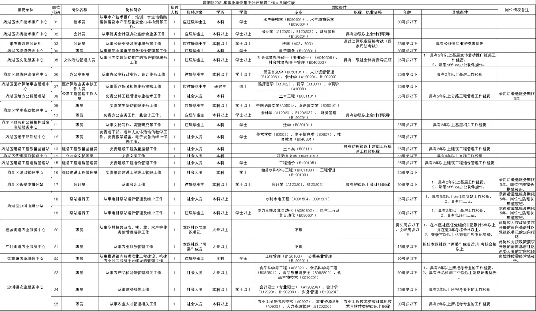 鼎湖區(qū)21個事業(yè)單位共招聘25名工作人員。