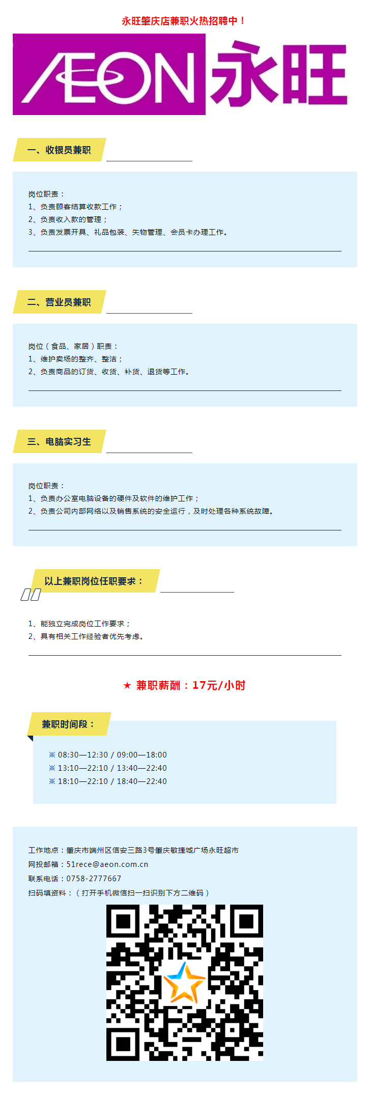 永旺肇慶店招聘電腦實習(xí)生,收銀/營業(yè)員兼職,17元/小時!